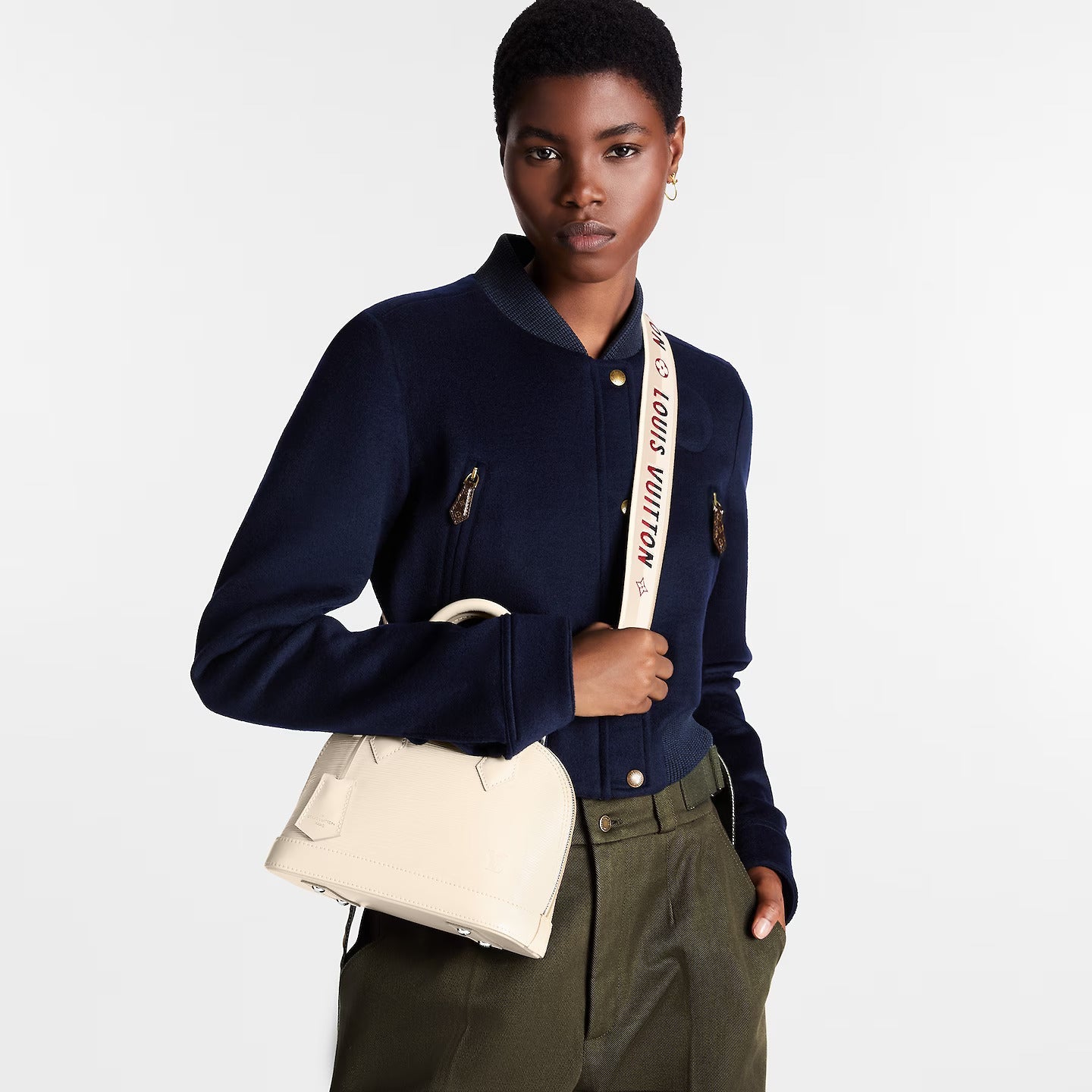 One of the House’s most recognizable bags, the adorable Alma BB handbag gets a sporty makeover thanks to a new Jacquard strap. The fashionably wide strap is embroidered with Louis Vuitton on one side and Monogram Blossoms on the other, and features delicate stitching along its edges. Made from colorful Epi leather, this bag will definitely turn heads.