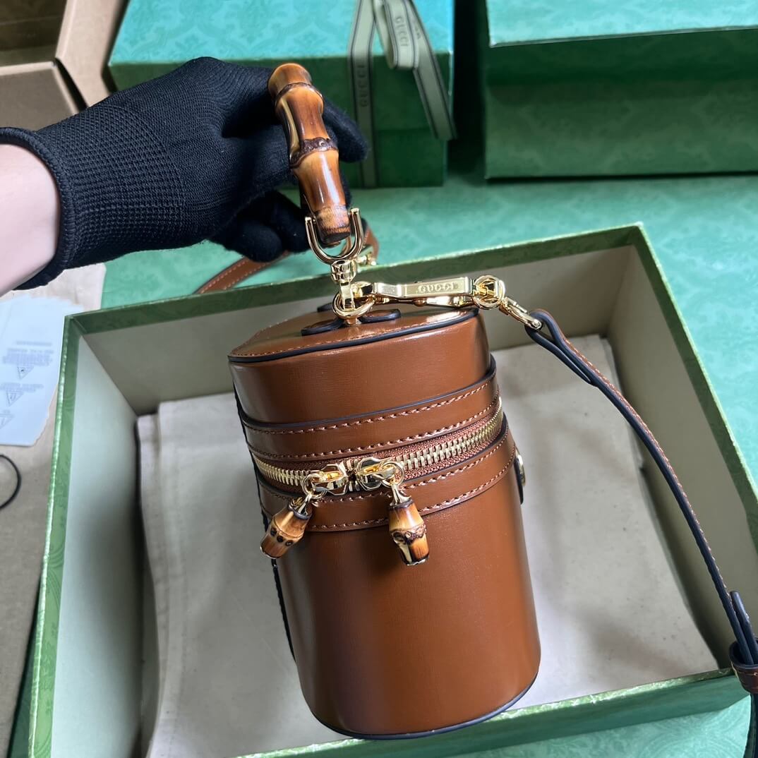 - Brown leather paired with gold-toned hardware and bamboo handle.