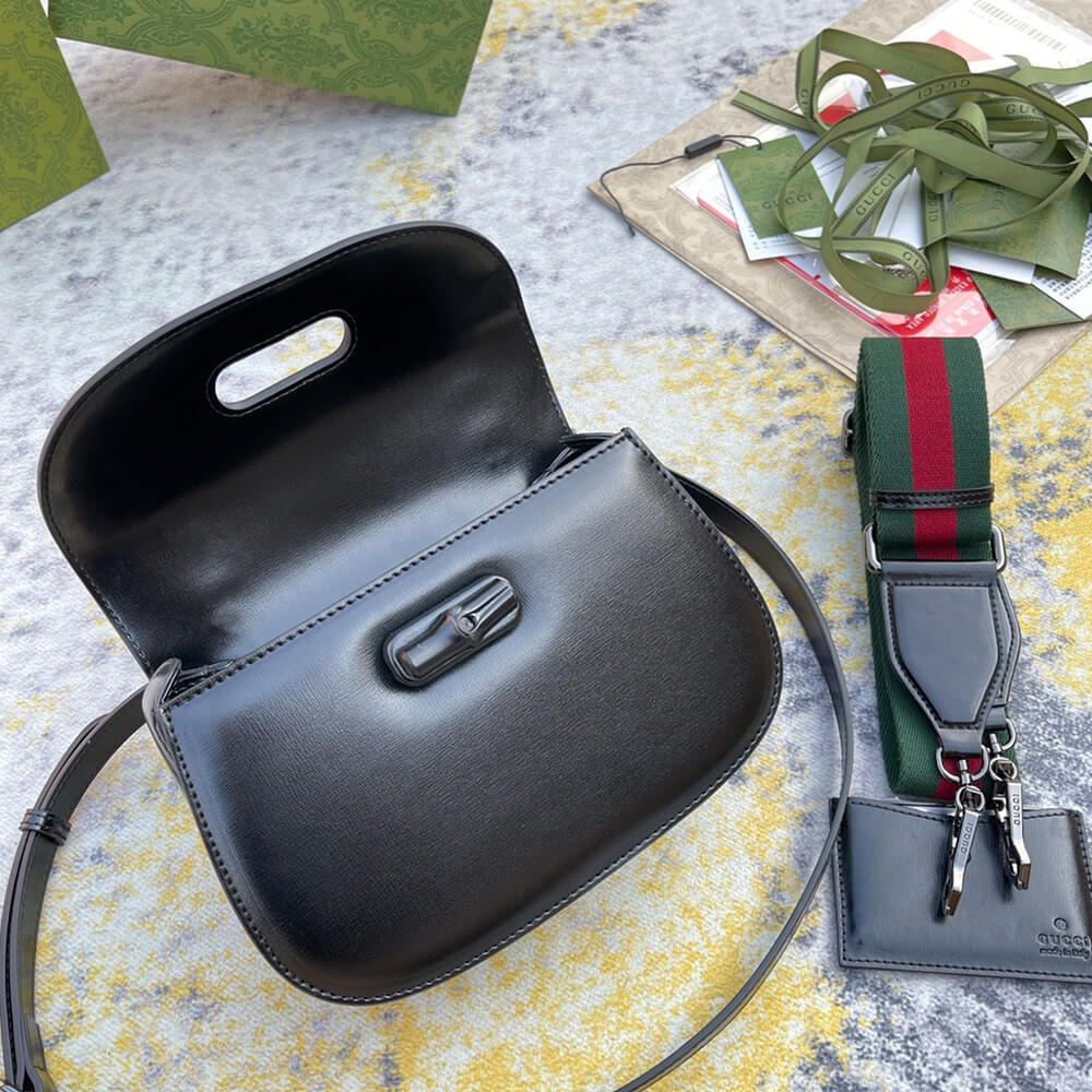 - Crafted from black leather with unique black bamboo hardware.