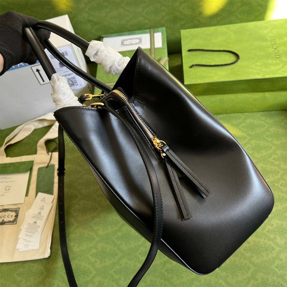 - Replica Gucci large tote bag crafted in smooth black leather.