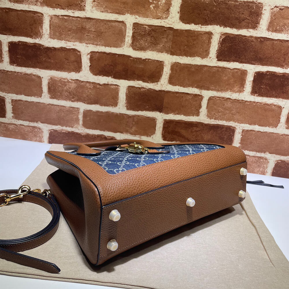 - Dark blue & ivory GG jacquard with elegant brown leather trim.