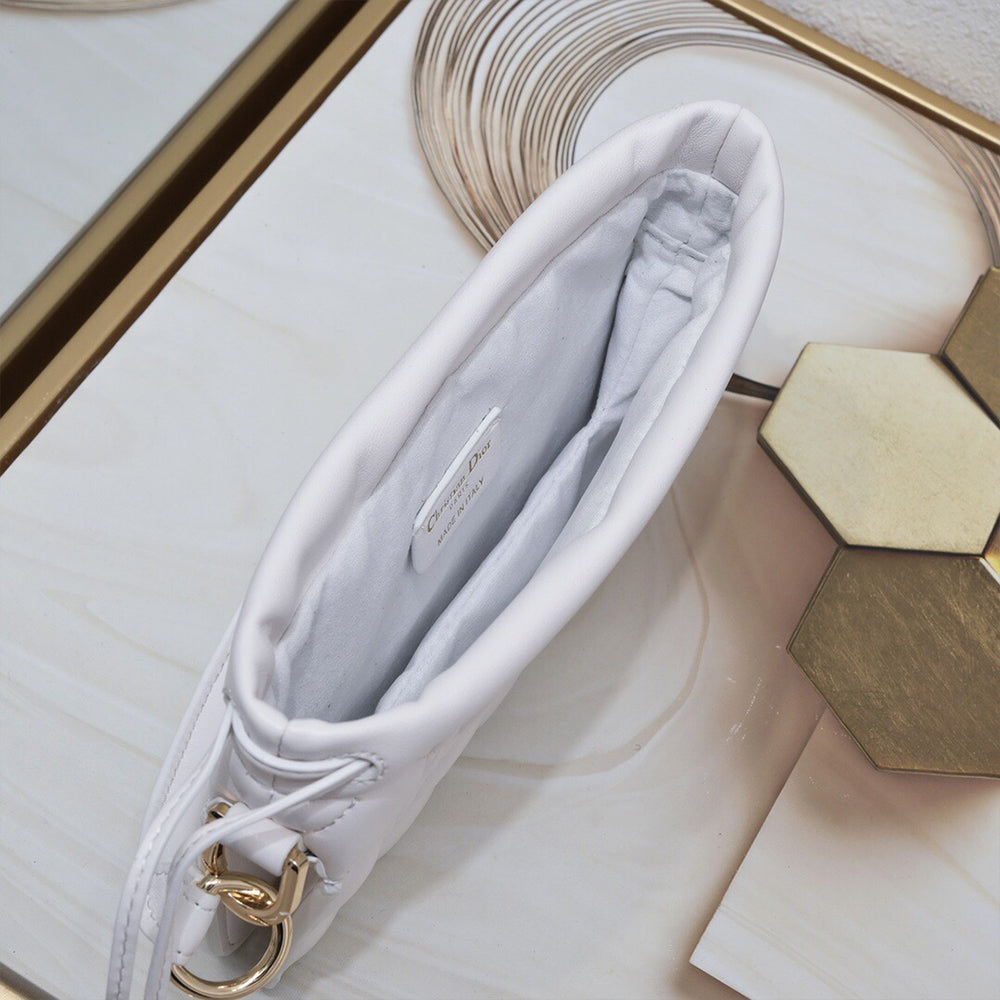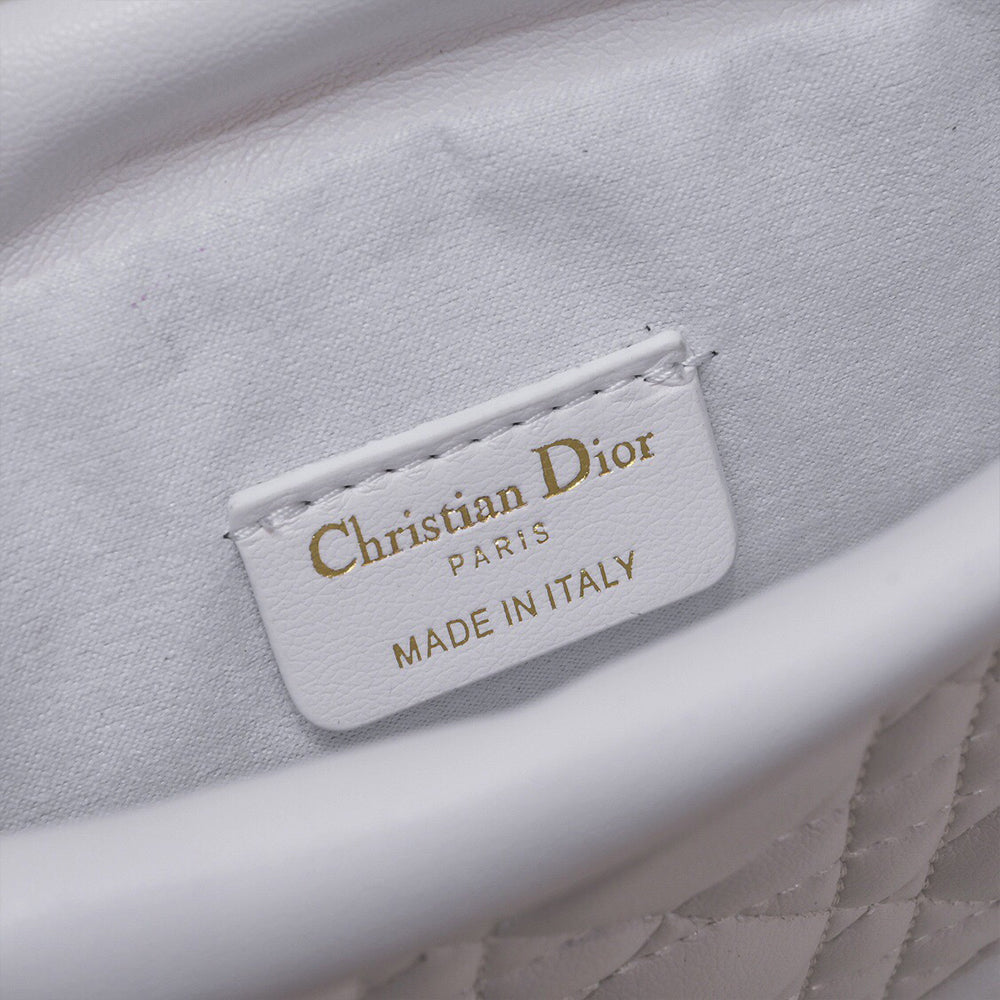 - Front D.I.O.R. charm, drawstring closure, removable leather top handle, removable jewel chain