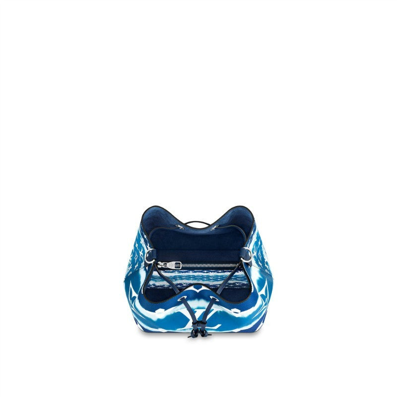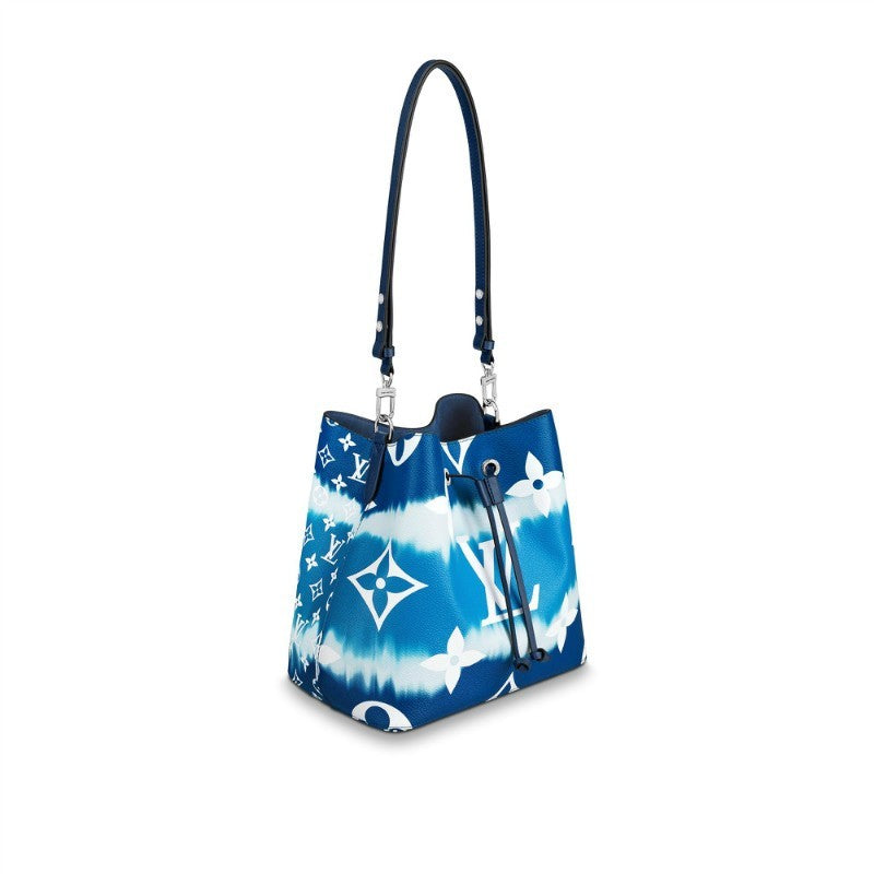 The NéoNoé bucket bag comes in Tie-Dye Monogram canvas for the Louis Vuitton Escale Collection. Present across Louis Vuitton handbags, shoes and ready-to-wear this season, this unexpected motif is inspired by the Japanese Shibori technique of knotting fabric before dyeing it. A lightweight bag, with a removable strap for a shoulder or cross-body carry.