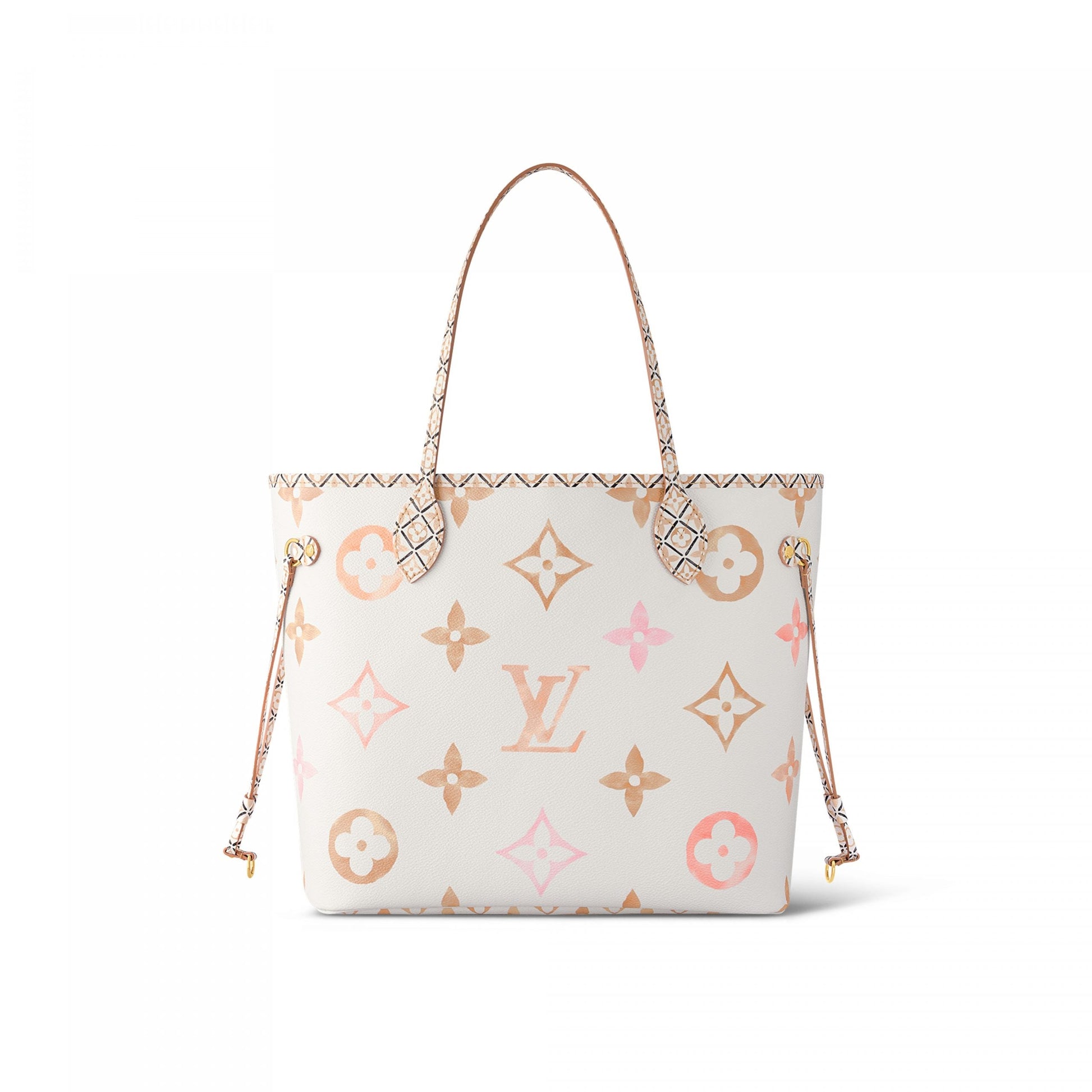 The Neverfull MM tote is summer-ready in cream-color canvas with a Giant Monogram pattern in pastel. The LV’s and Monogram Flowers are rendered irregularly, as if in watercolor, and are perfectly complemented by the dense Monogram Blossom print on the trim along the top of the bag and on the handles and their mounts.
