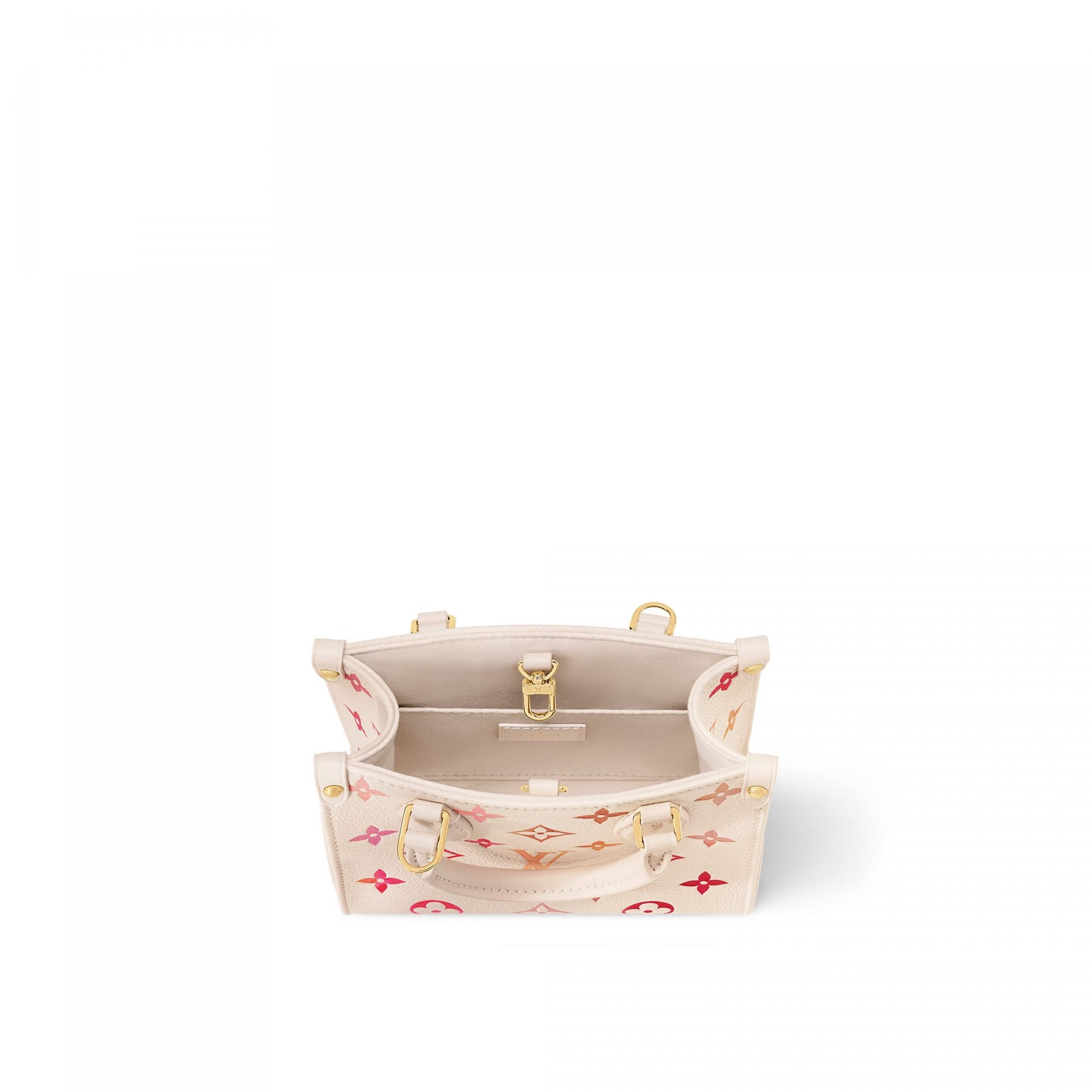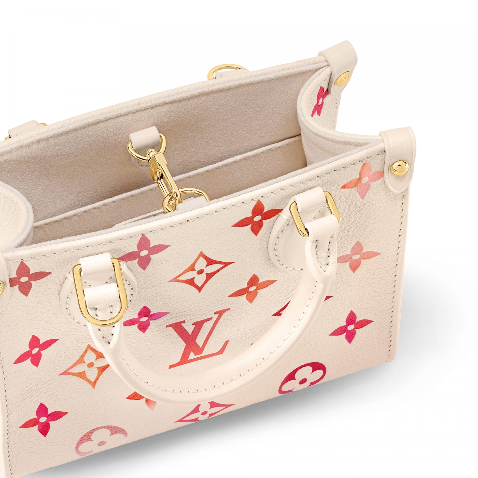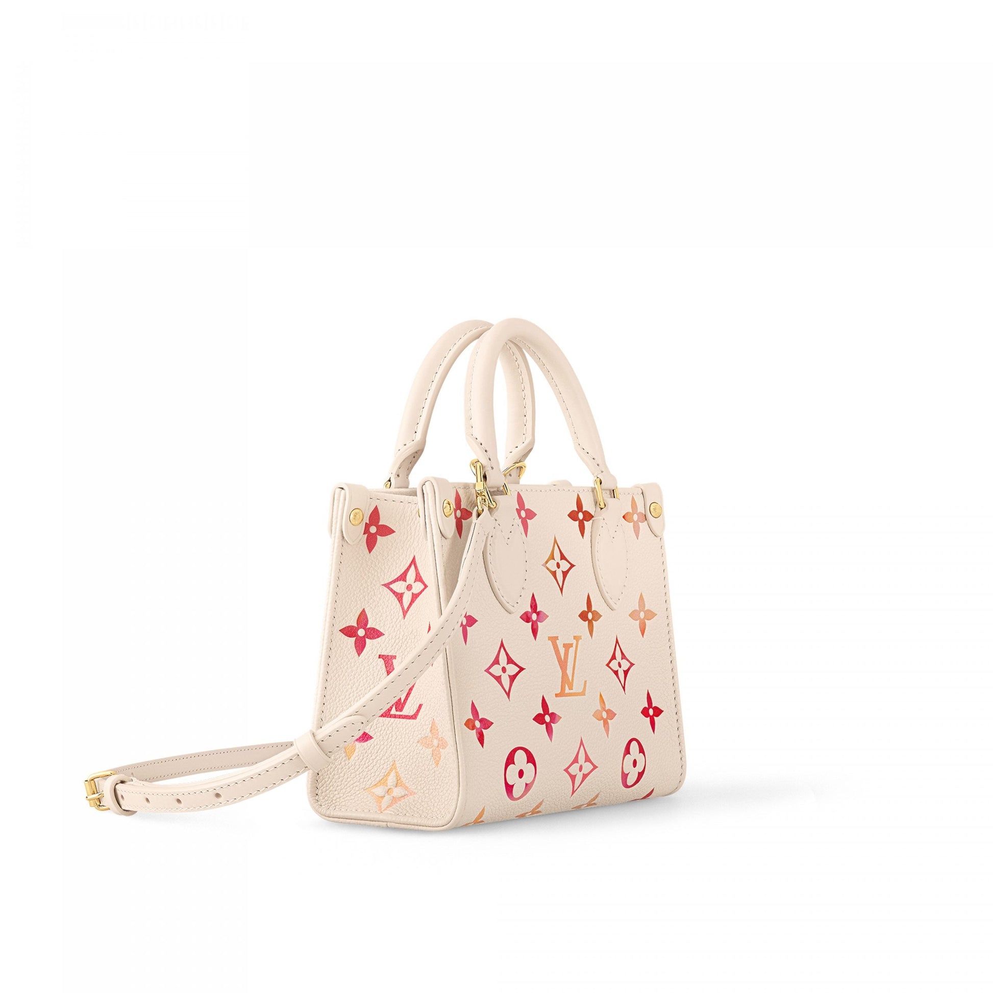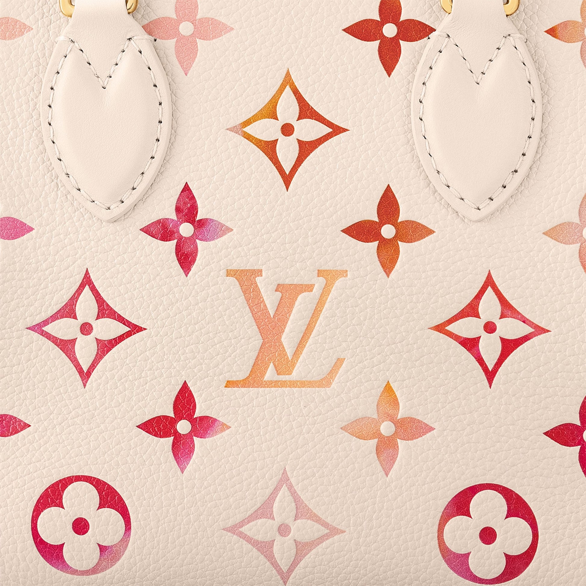 Part of the Sunrise Aquarelle collection, this OnTheGo BB handbag is fashioned from Monogram Empreinte leather in a colorway of orange, pink and fuchsia, inspired by sunrise. The LVs and Monogram Blossoms printed on the leather have a watercolor aspect. A hint of glossiness is screen-printed onto the surface, like glistening drops of morning dew. Two rolled-leather top handles and a removable and adjustable strap enable various carry options.