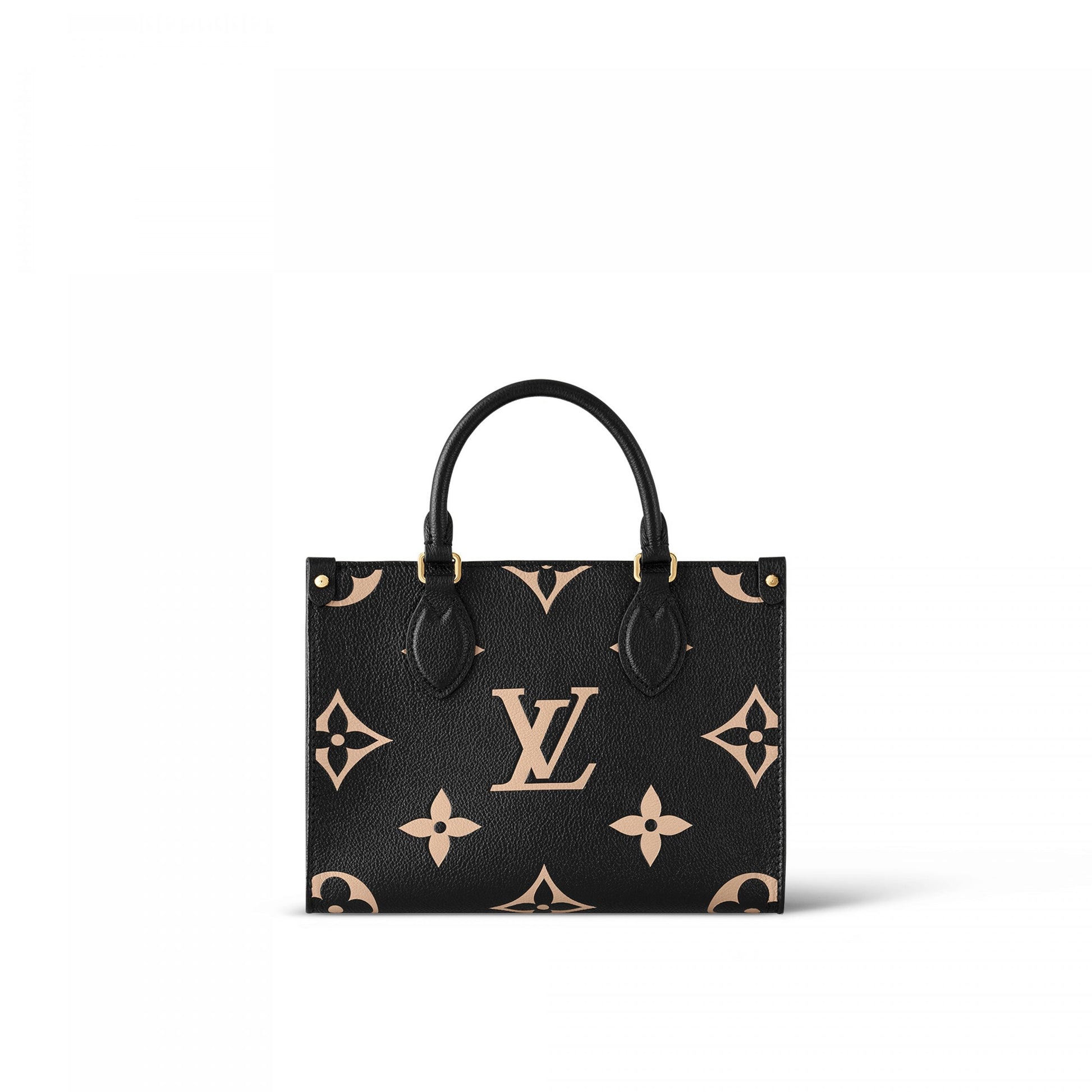 Inspired by Louis Vuitton’s famous Sac Plat from 1968, the OnTheGo PM tote is fashioned in Monogram Empreinte leather, embossed with a Medium Bicolor Monogram pattern. This smaller version of the original OnTheGo fits essentials such as an iPad Mini. Articulated top handles and an adjustable removable strap offer a variety of carry options.