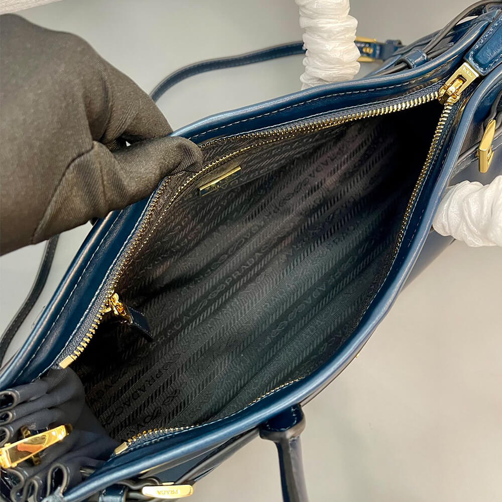- Interior Details: Nappa and nylon interior with center zipper compartment and zipper patch pocket