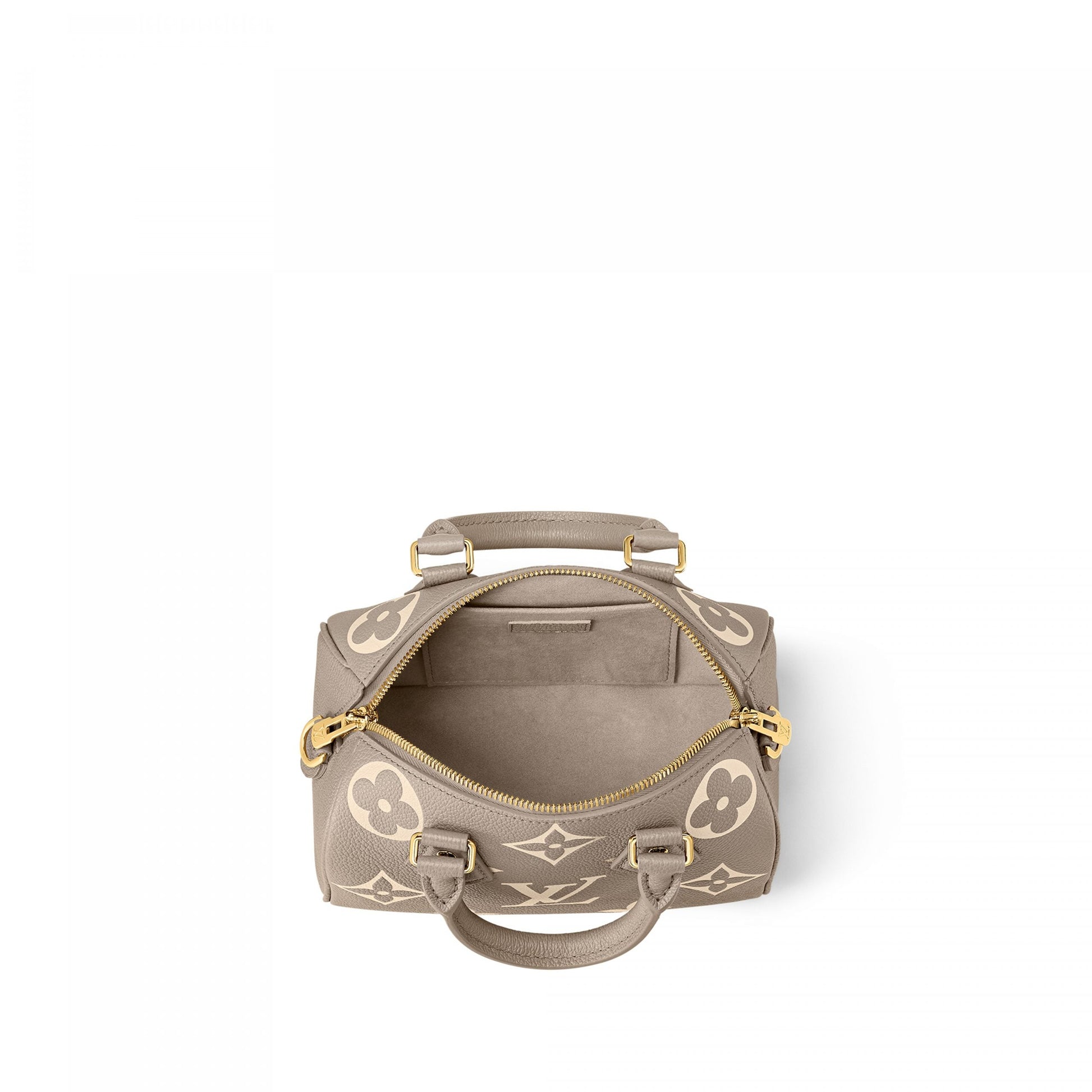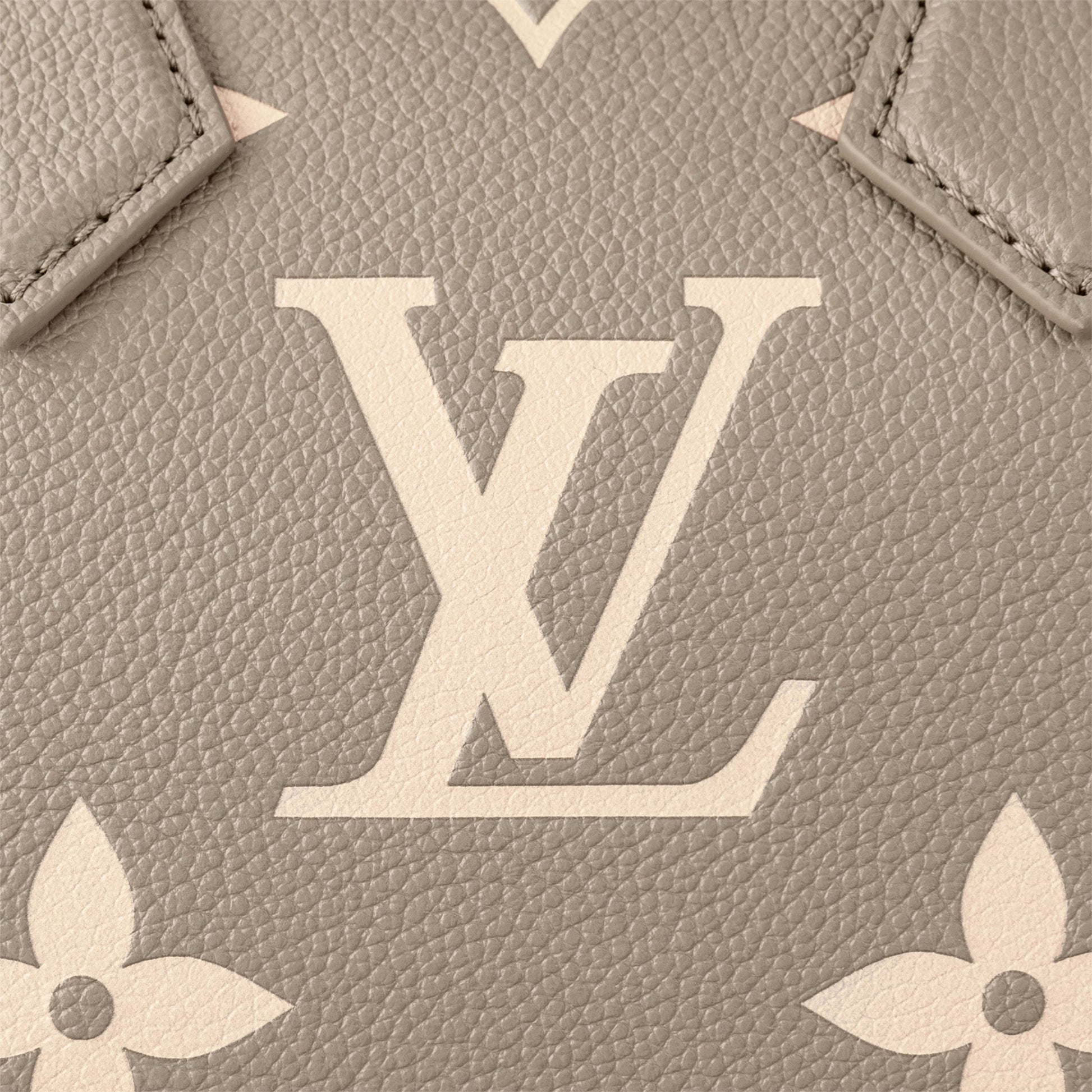 Made from two-tone Monogram Empreinte leather with the LVs and Monogram Flowers in a cream color, the Speedy Bandoulière 20 handbag is a modern classic. Inspired by the House’s Speedy luggage line introduced in the 1930s, it features the same shape and articulated top handles. A chain-and-leather strap enables shoulder and cross-body wear.
