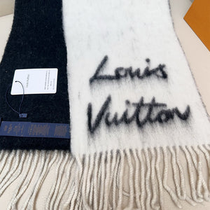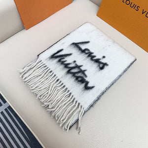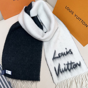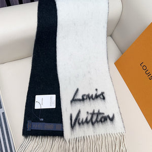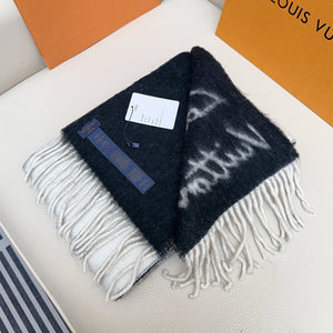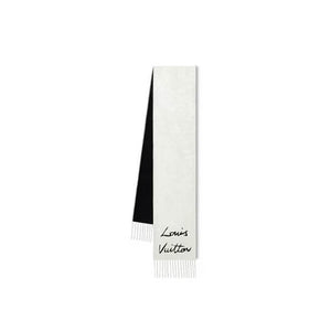 A long, narrow, high-end designer-inspired scarf in Black. Made from a warm wool and alpaca blend, it features a Louis Vuitton woven logo in a Jacquard weave and is finished with a tassel trim.