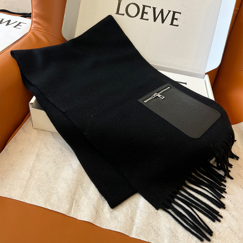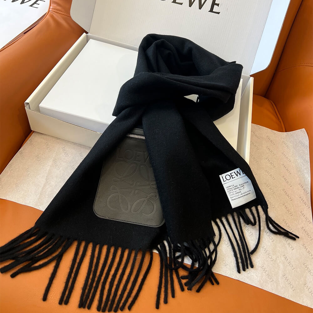 A designer-inspired scarf in classic black, featuring a soft wool and cashmere blend and stylish fringed edges. This high-quality reproduction offers a modern, luxurious feel.