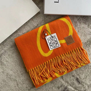 A brightly colored, designer-inspired scarf blending wool and cashmere in striking Orange and Yellow tones. This high-quality reproduction features fun fringed edges, adding personality to any look.