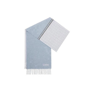 A vibrant, designer-inspired scarf featuring an Anagram all-over jacquard pattern in Blue and Light Blue. This high-quality wool/cashmere reproduction is finished with fringed edges and subtle corner embroidery.