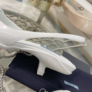 These pristine Super high-quality 1:1 copy replica shoes are crafted from glossy Patent leather and presented in clean White, featuring a comfortable 30 mm heel.